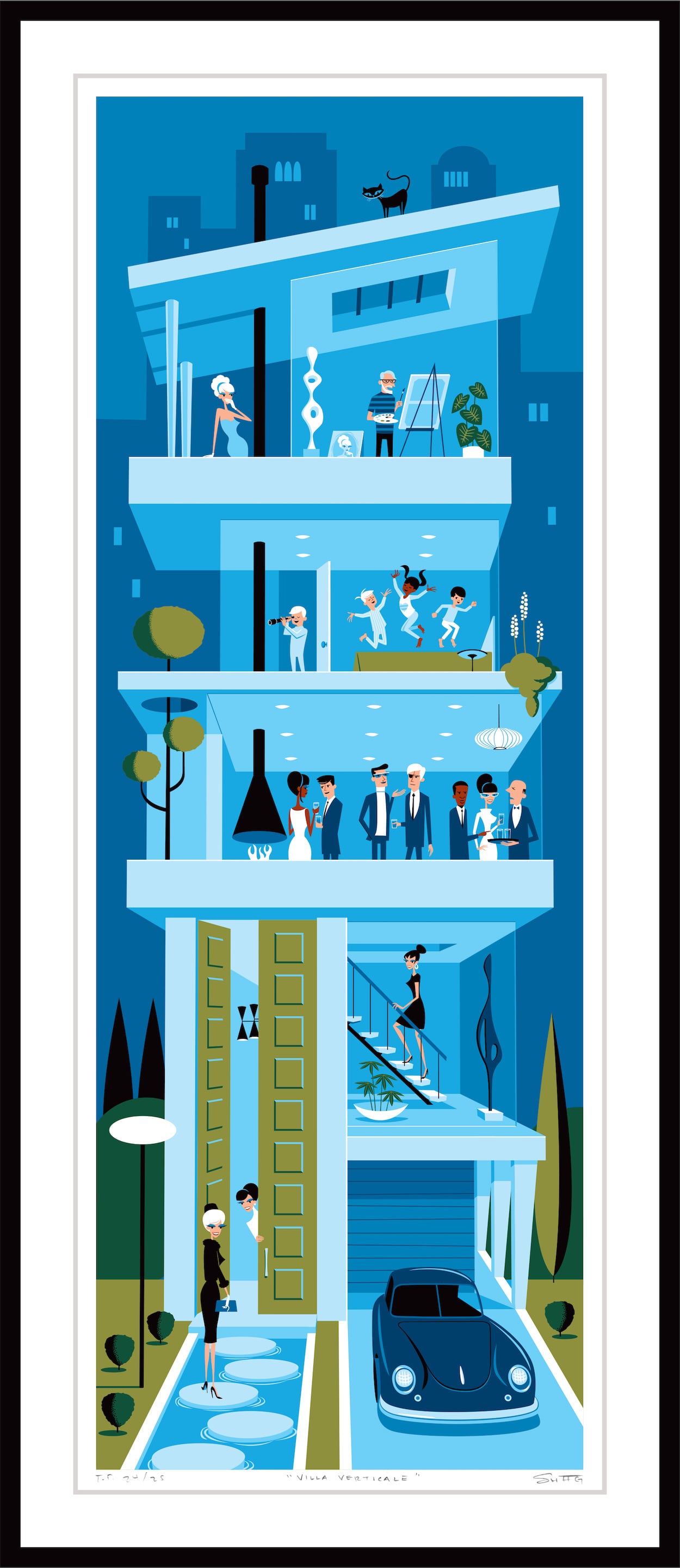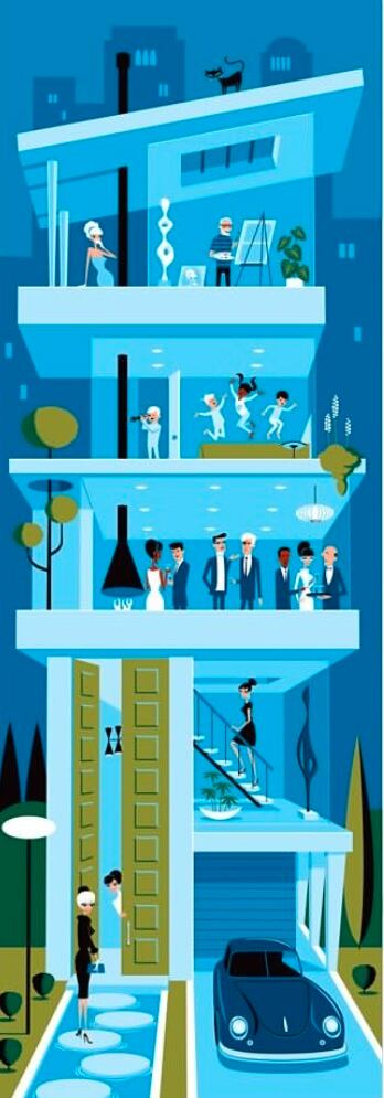 この作品ほど私が目立つことは滅多にありません。よく見て、私がいるかどうか確かめてみてください!私が描く初期の頃の作品は行きたい場所や一緒にいたい人を描いていました。今回の作品は4階建の建物の中でのカクテルパーティーの華やかさとミッドセンチュリーの壮大さで初期の気持ちに戻っています。
